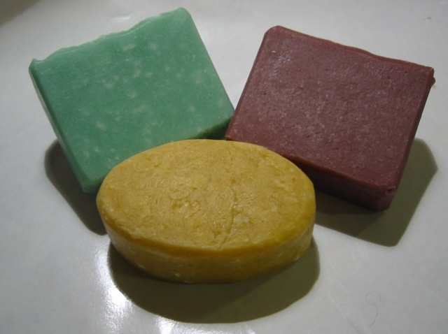 2/27 soaps unmolded and cut and trimmed Posted on March 2, 2010 by audrey Green: Olive type FOBurgundy: Sandalwood FOOrange: rebatched grapefruit EO, a bit more rustic since it was glopped into the oval mold