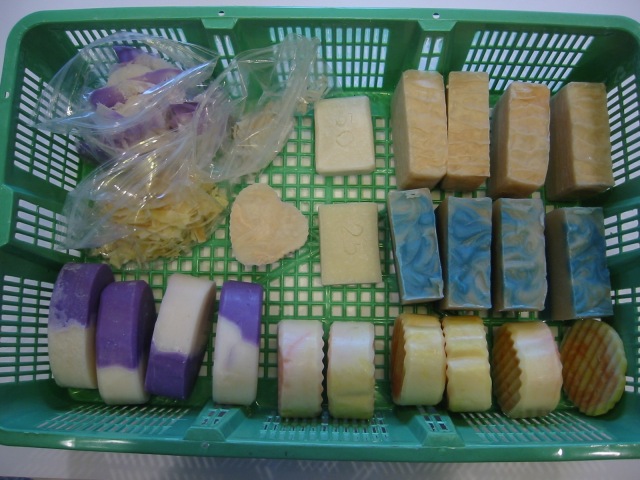 All the 3/28 soaps Posted on March 30, 2010 by audrey The baggies contain shavings of the soaps when I trim the sides. I think I'll use these shavings as well as other shavings I have collected to embed them into a solid color soap at some point. They'll look like confetti.