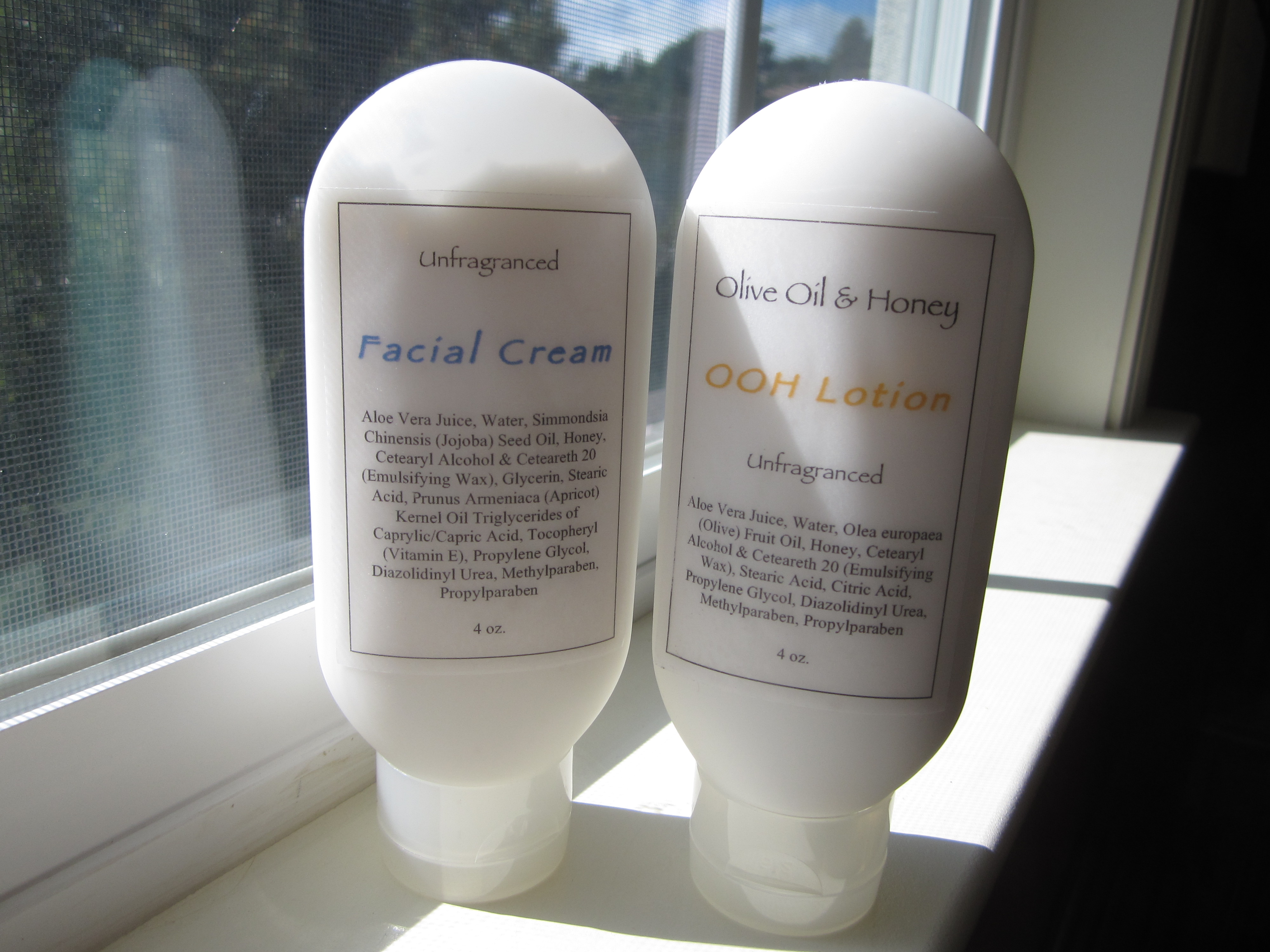 It was really cool and easy to do! This particular recipe called for among other things olive oil and honey, so it's OOH Lotion! The recipe also called for cider vinegar. Well, the finished product still smells of vinegar (which I was warned about) with a little honey. The recipe had an alternative, using citric acid instead of the vinegar. The vinegar smell doesn't last on the skin, but I think next time I'll use the citric acid instead. That way I'm hoping I'll just smell honey. The lotion came out really creamy and thick. So cool that with the right ingredients, oil and water emulsify to make lotion! I did put a preservative into the lotion to keep the germies away. Neato!